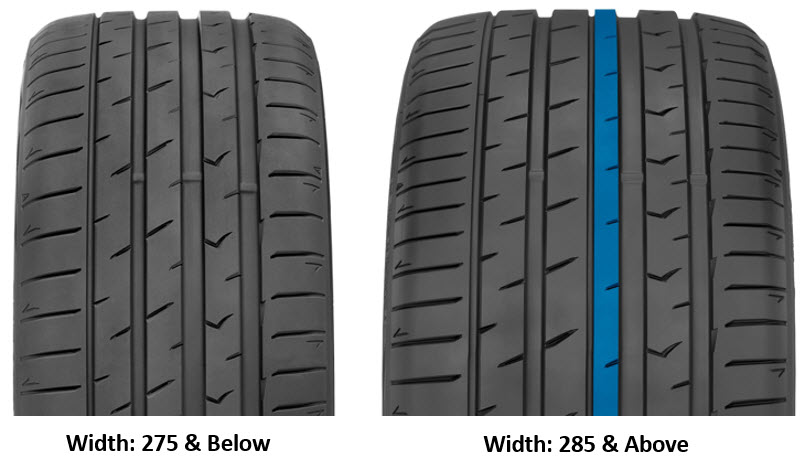 • Tread patterns for Proxes Sport 2 vary by width. Section widths of 285 and above have an additional center rib.